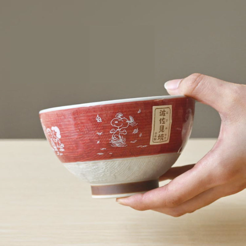 碗身以溫暖的磚紅色為主調,搭配白色線條勾勒出悠閒的史諾比與朋友們,讓用餐時光增添療癒氛圍。不論是日常盛飯還是用來裝湯都恰到好處。
